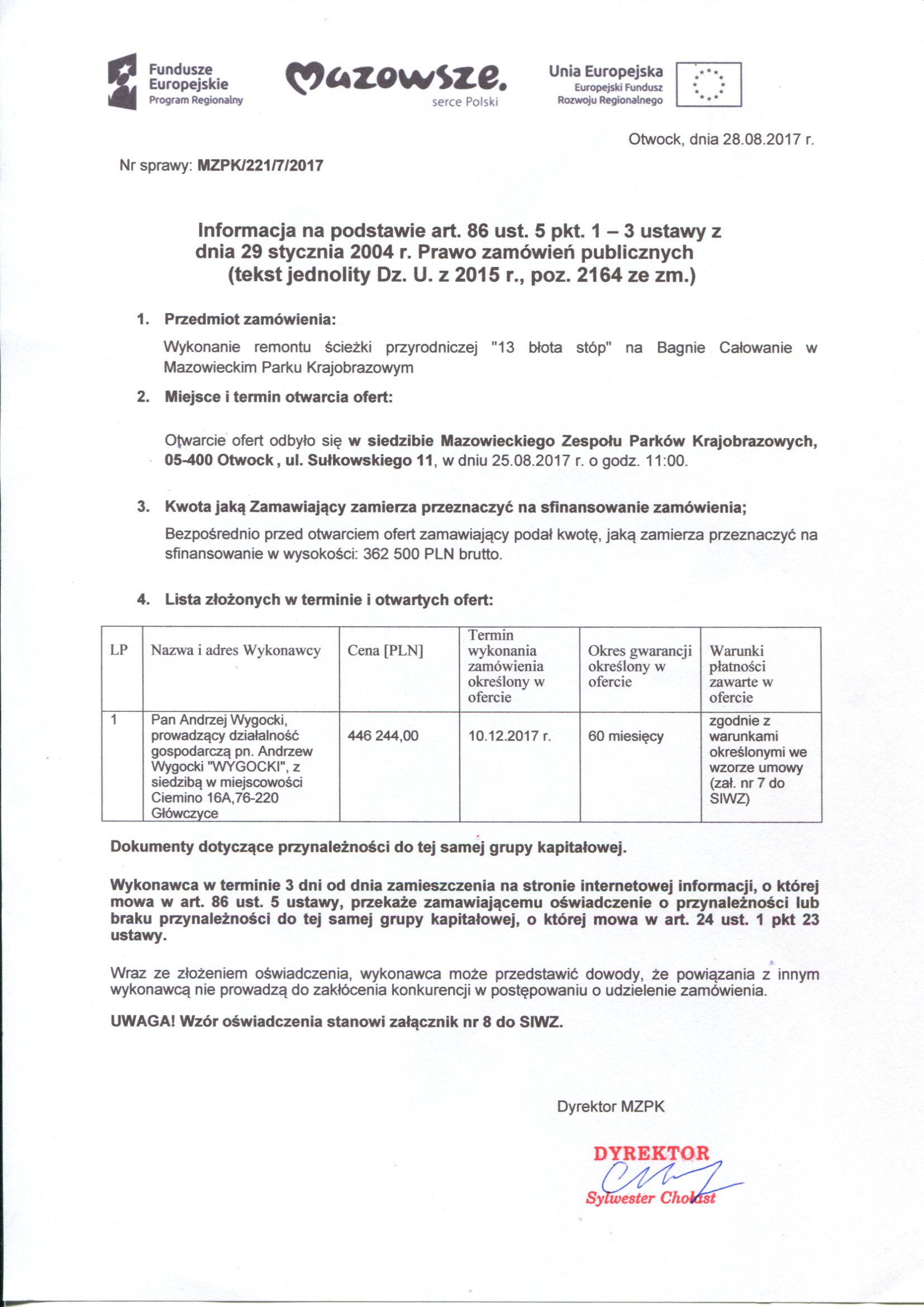 Informacja na podstawie art. 86 ust. 5 pkt. 1 -3 ustawy z dnia 29 stycznia 2004 r. Pzp.